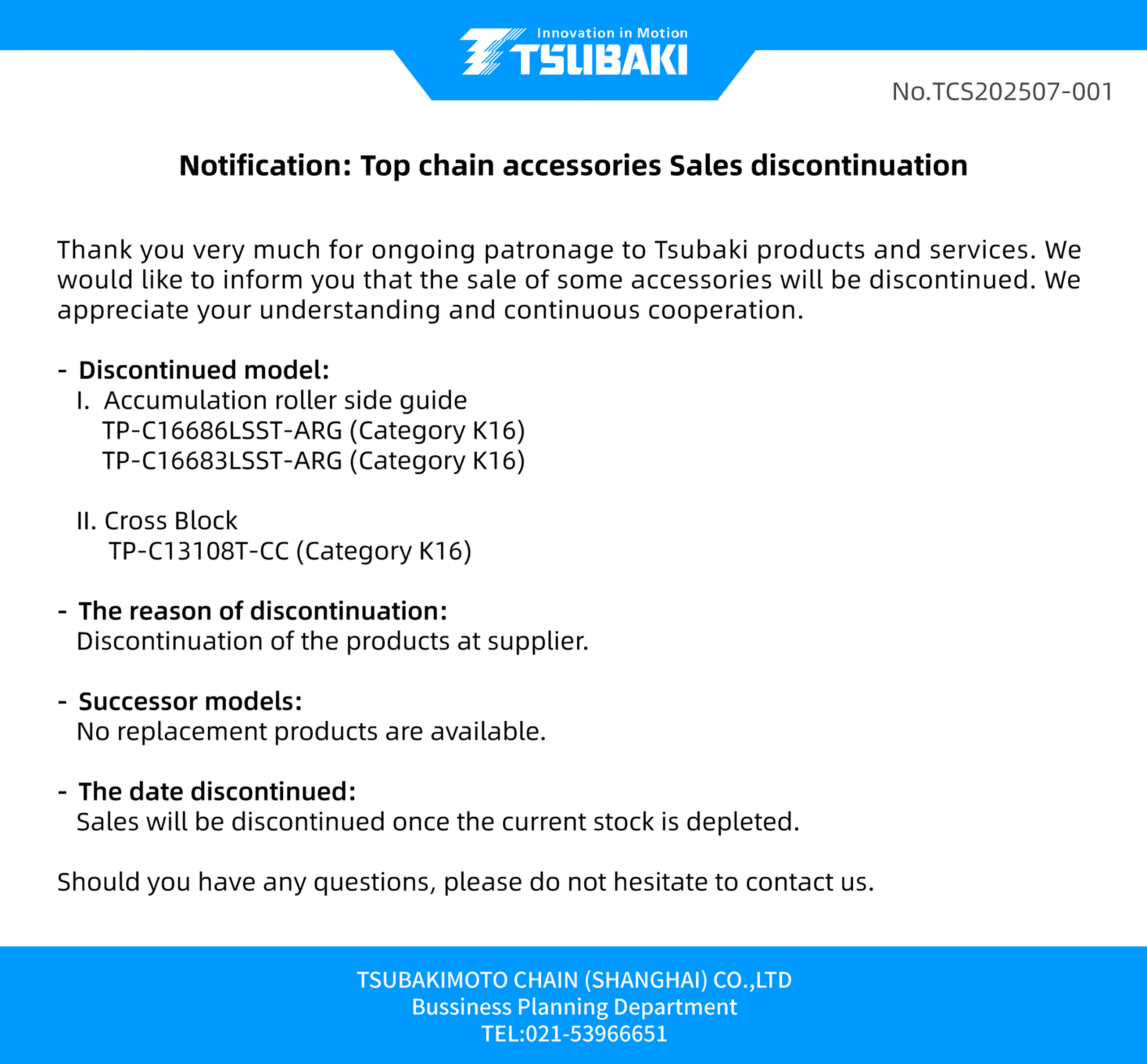 Notification: Top chain accessories Sales discontinuation